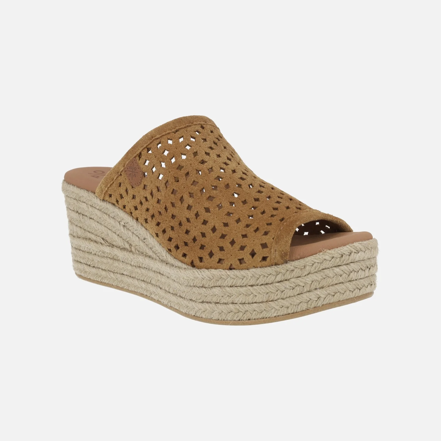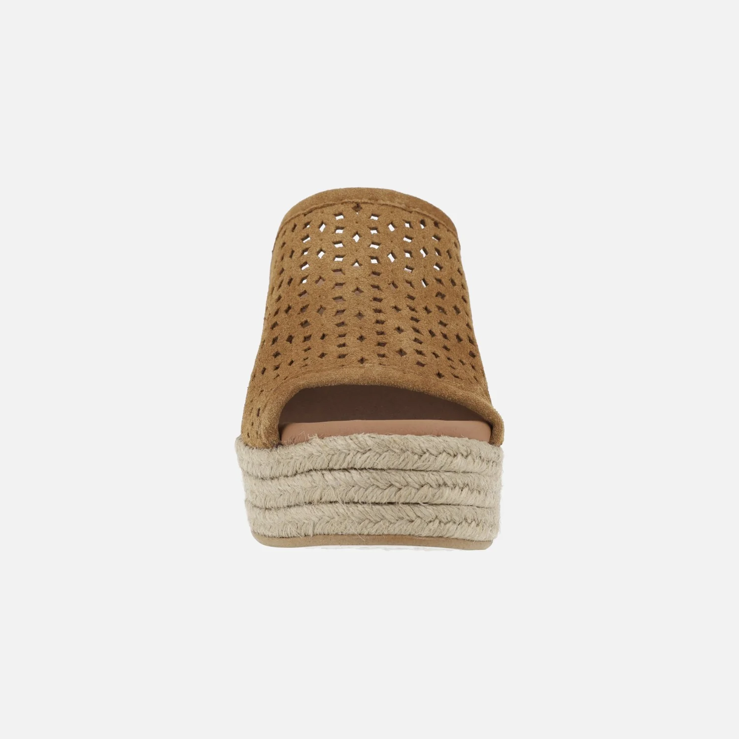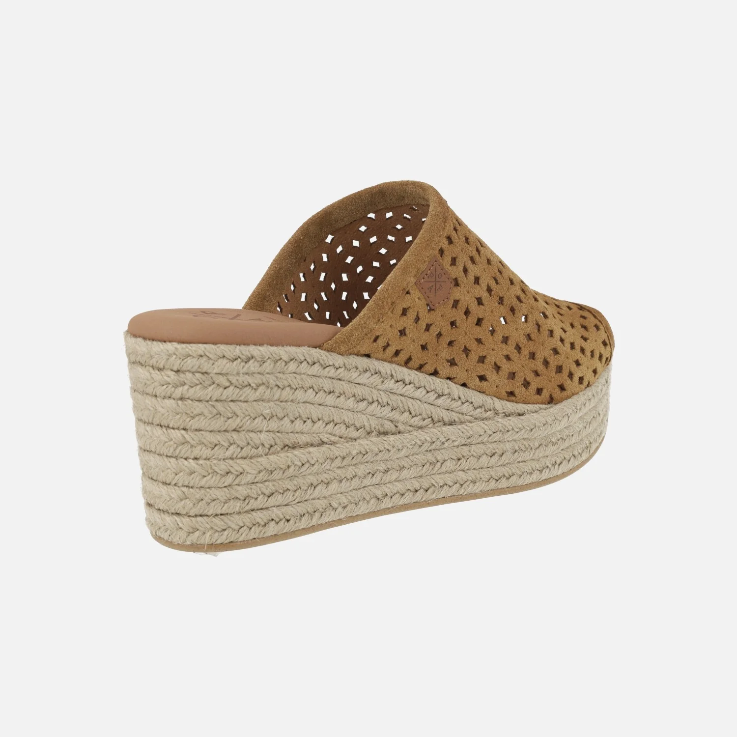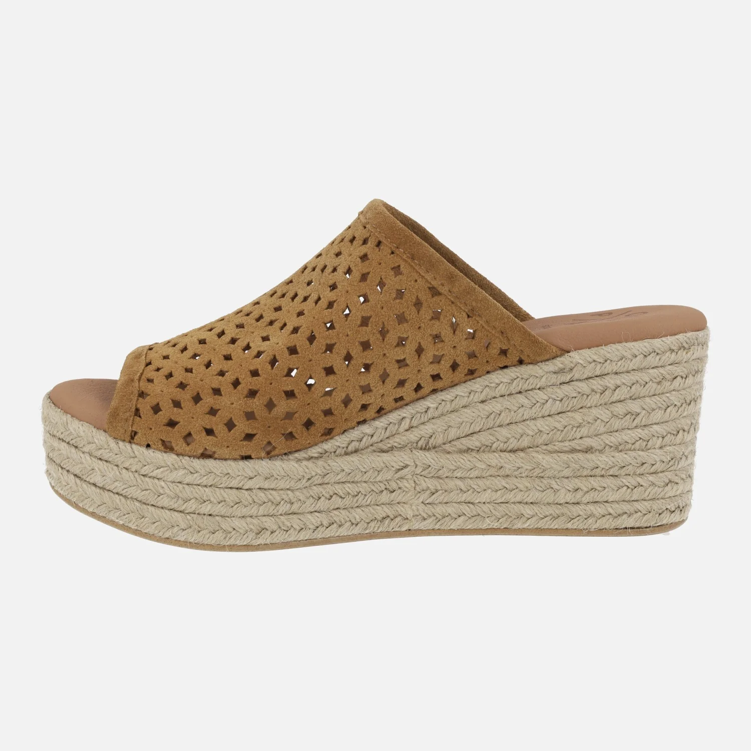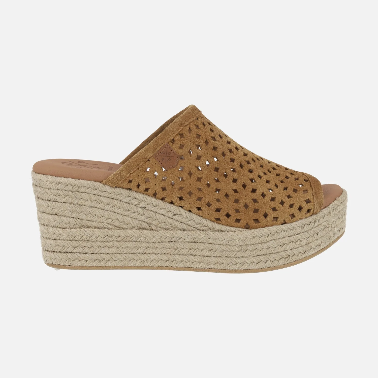 Zuecos de esparto de la marca Popa modelo Arenita picado cuero. Zuecos abiertos de puntera, elaborados en piel serraje con detalle de picados. Interiores forrados en piel vegana (sintéticos) con planta acolchada. Cuña alta de yute natural, de 7,5 cms de altura trasera y 3,5 cms de plataforma delantera.