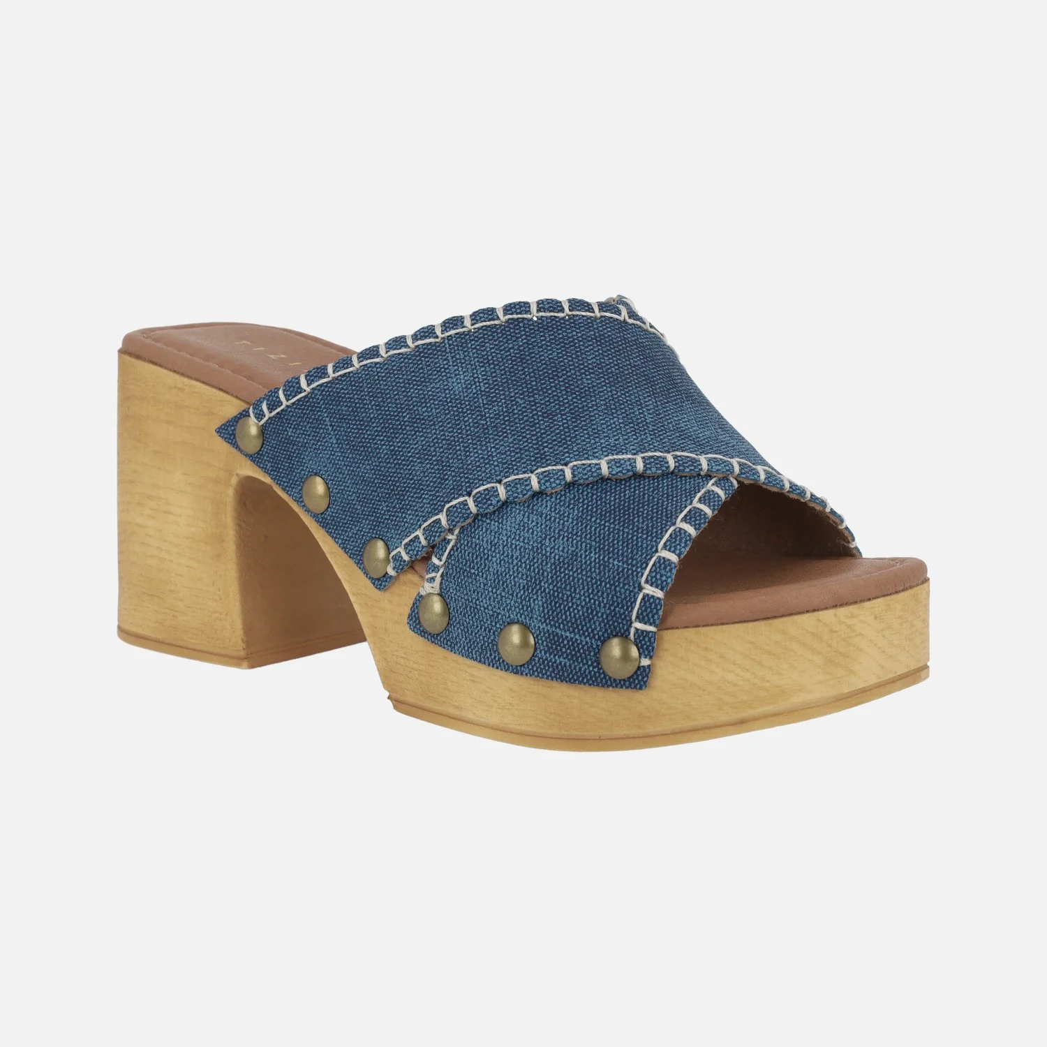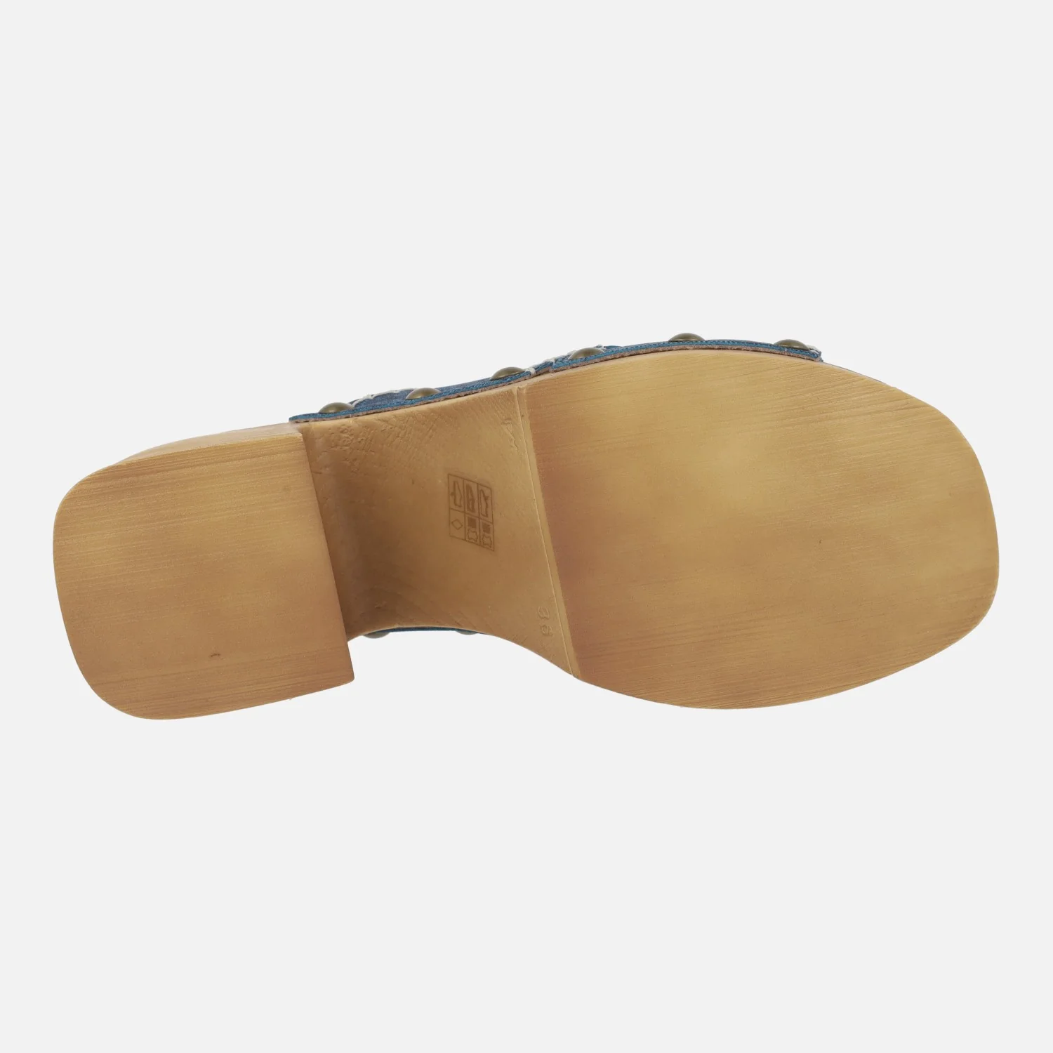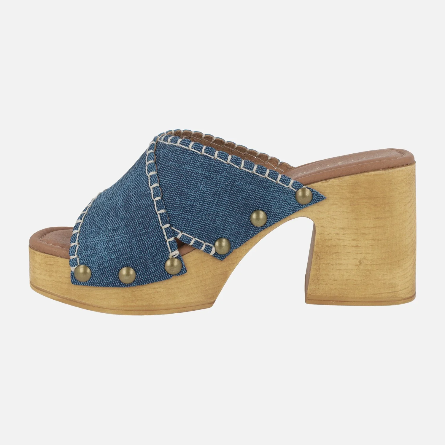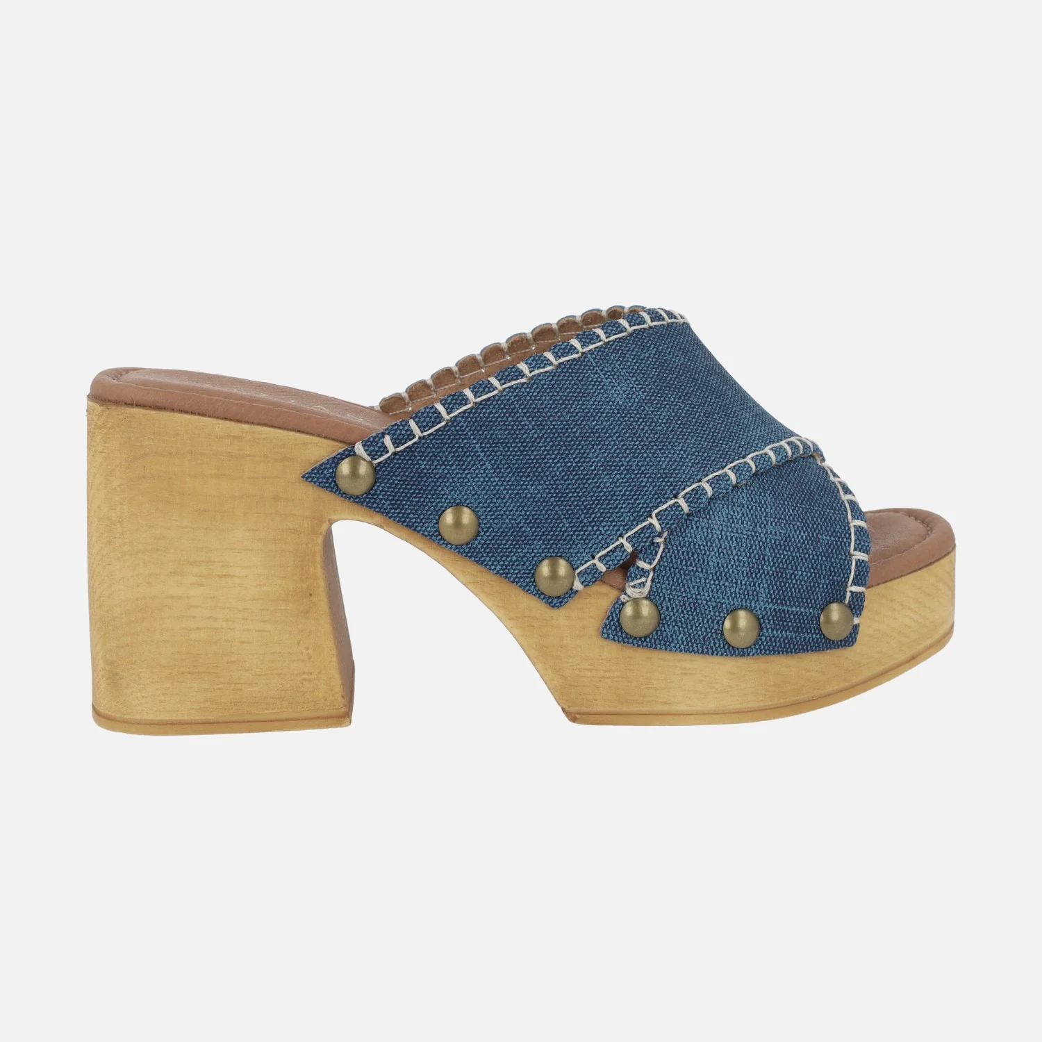 Sandalias de tacón alto y plataforma Tiziana, modelo 28 Jeans. Sandalias estilo zuecos, con dos tiras en tejido denim azul que cruzan en el empeine. Pespunteado blanco. Detalle de tachas metálicas en la unión con el piso. Interior mixto piel/tejido. Plataforma y tacones imitando madera, con una altura de 8 cms de tacón y 3 cms de plataforma delantera.