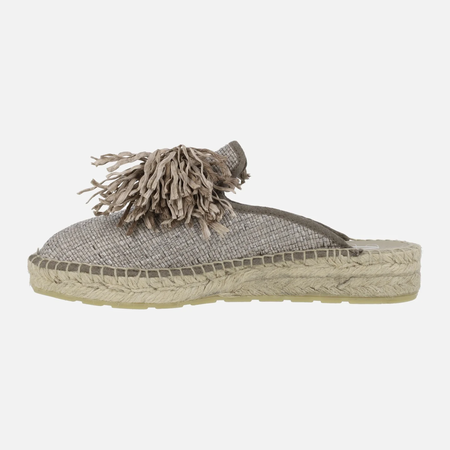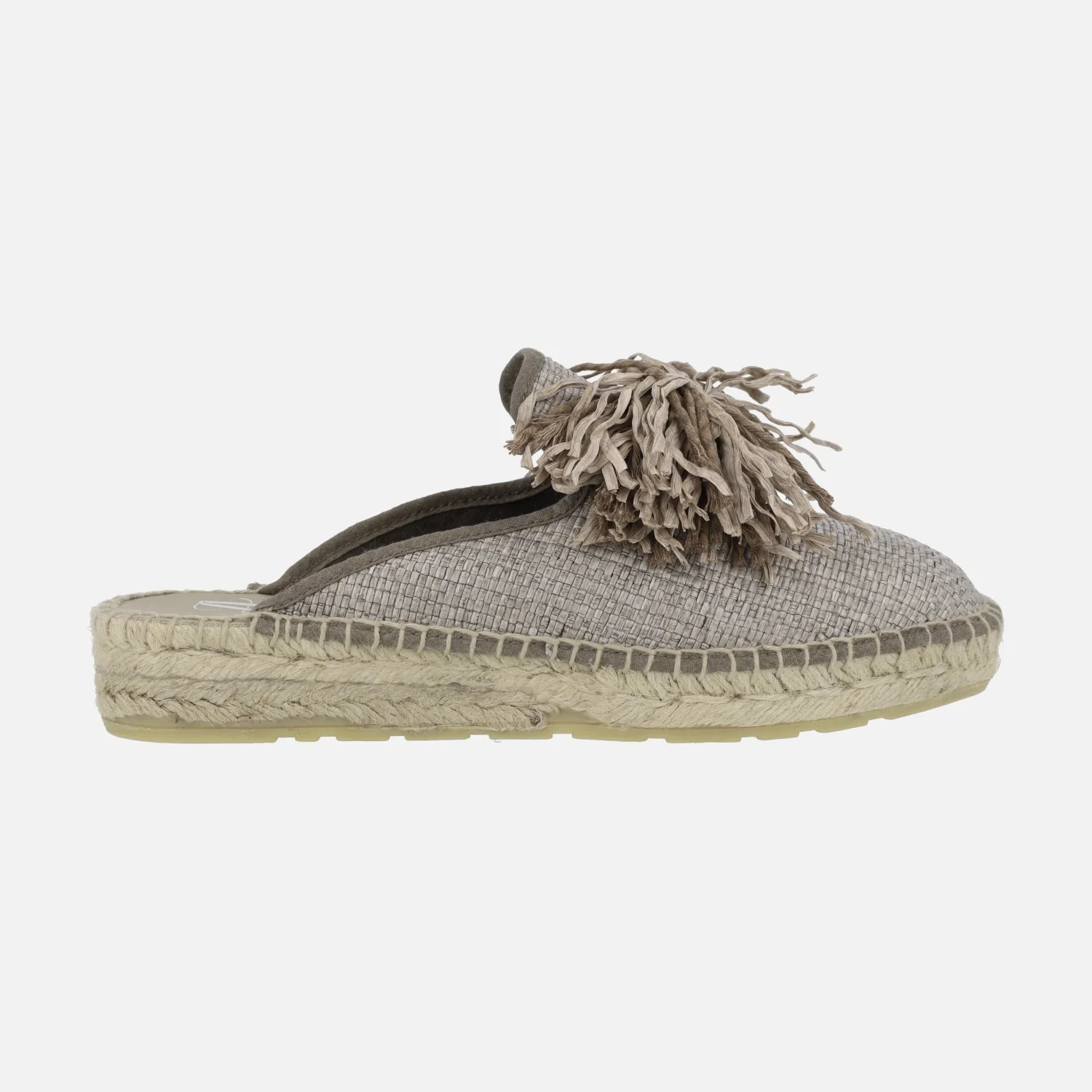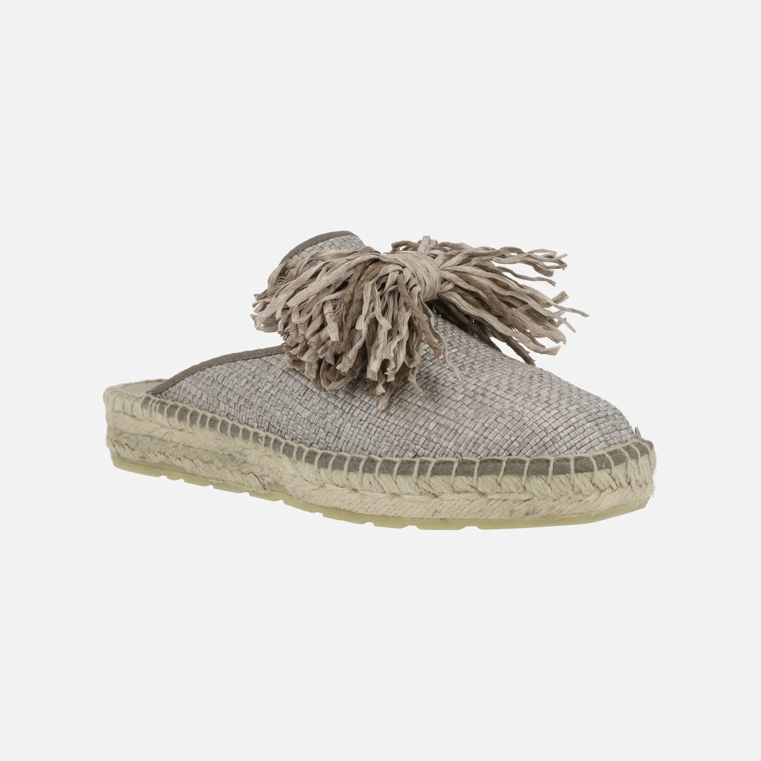 Zuecos para mujer con plataforma de esparto, modelo 2522 Tostado de la marca española Juncal Aguirre. Zuecos elaborados en tejido rafia con adorno de lazo en la parte superior. Interior en combinado piel y tejido. Plataforma de yute natural, con suela de goma. Altura trasera 3 cms (2 cms parte delantera). Made in Spain.