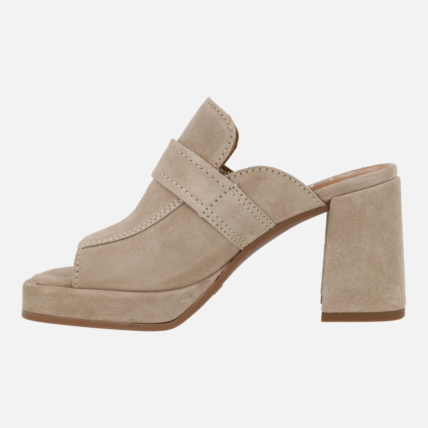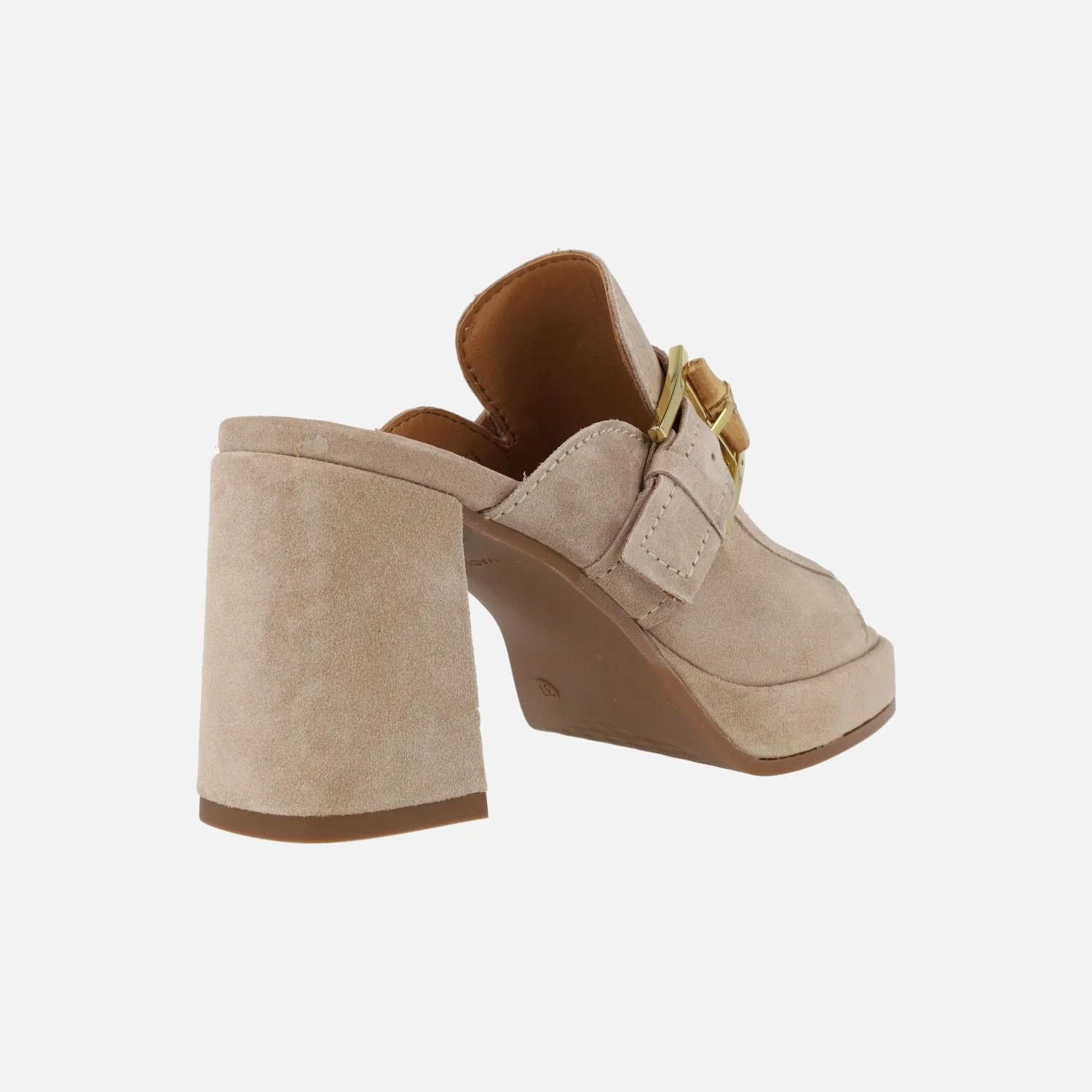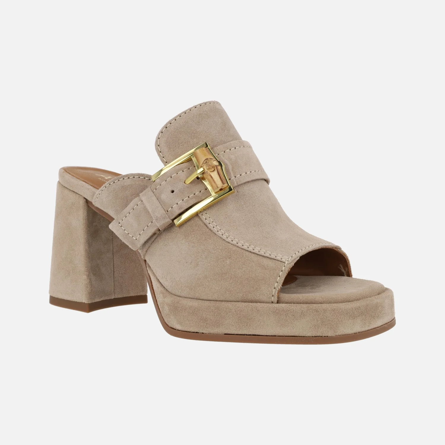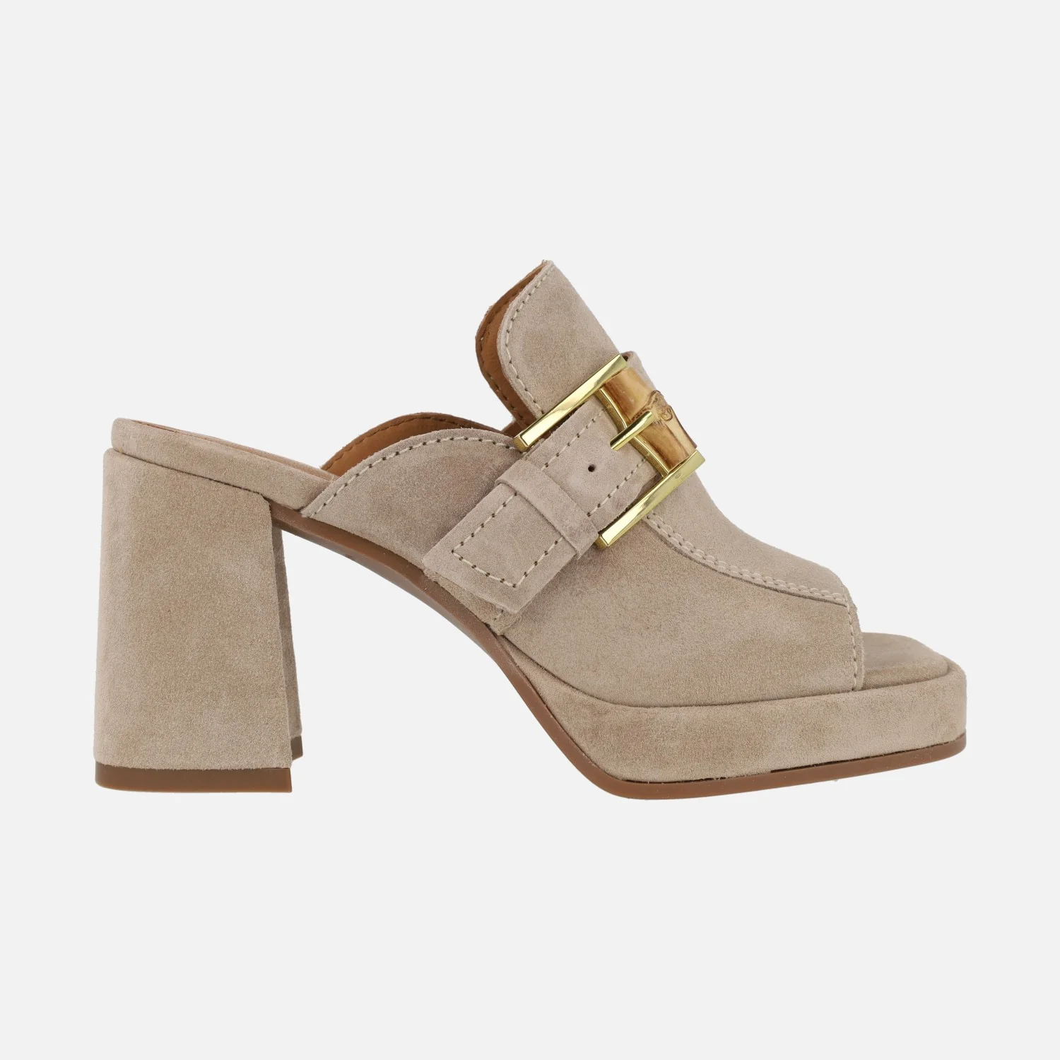 Zuecos para mujer de la marca Alpe modelo Chiara 5125 Dessert. Zuecos elaborados en ante beige, abiertos de puntera y con detalle de tira con hebilla cruzando la pala (hebilla dorada con pieza de madera). Interior textil. Tacones altos, forrados de ante, con 9 cms de altura (plataforma de 2,5 cms). Made in Spain.