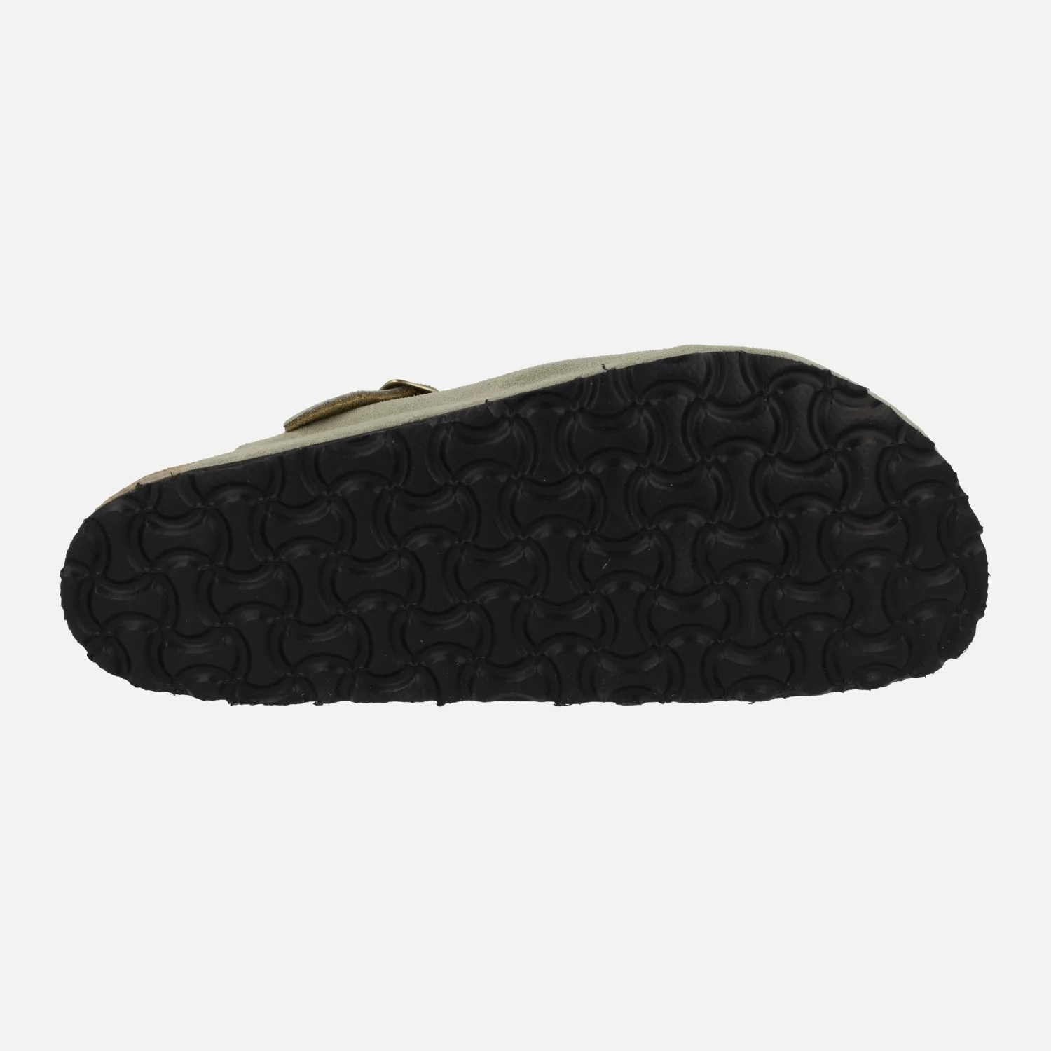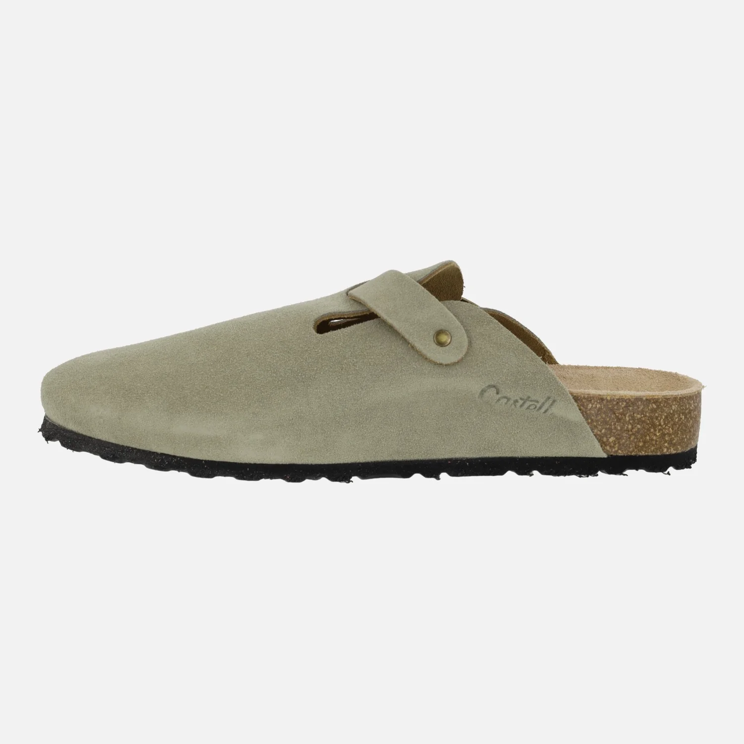 Zuecos anatómicos para hombre de la marca Castell modelo A0007477 basket salvia. Zuecos elaborados en piel seraje color verde kaki con hebilla regulable. Planta e interiores de piel. Zuecos estilo bio, con entresuela de corcho y piso de goma micro.