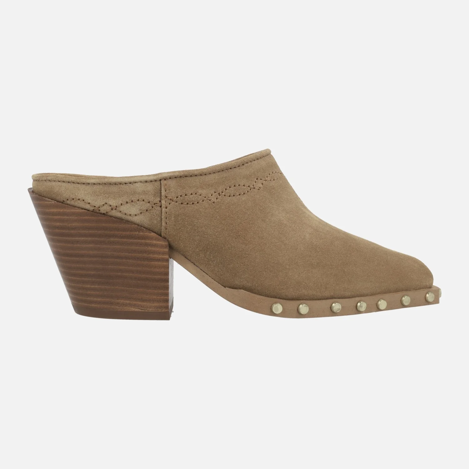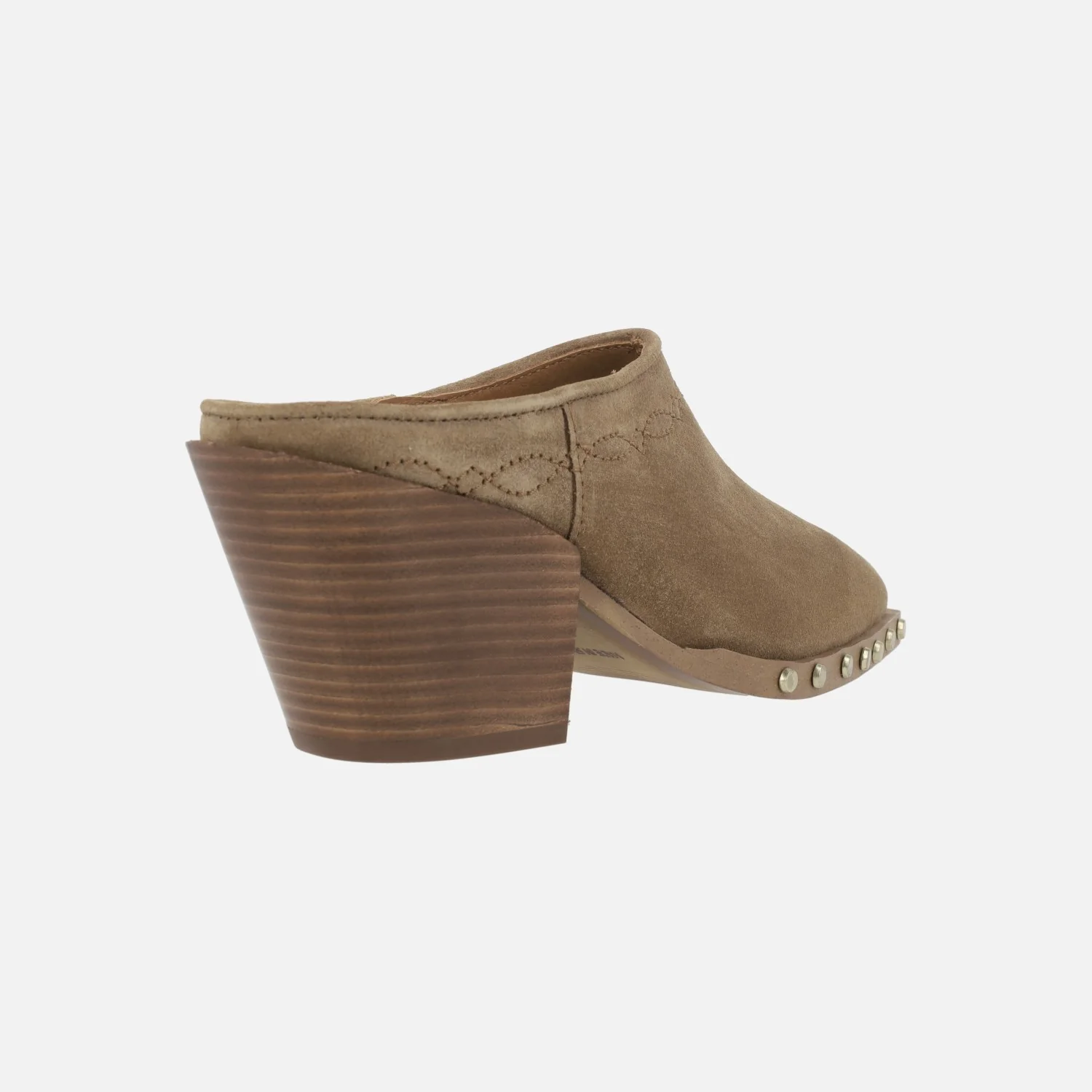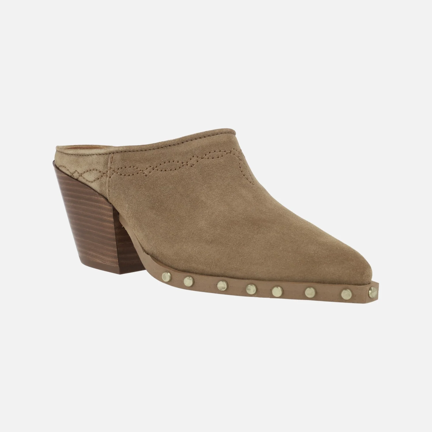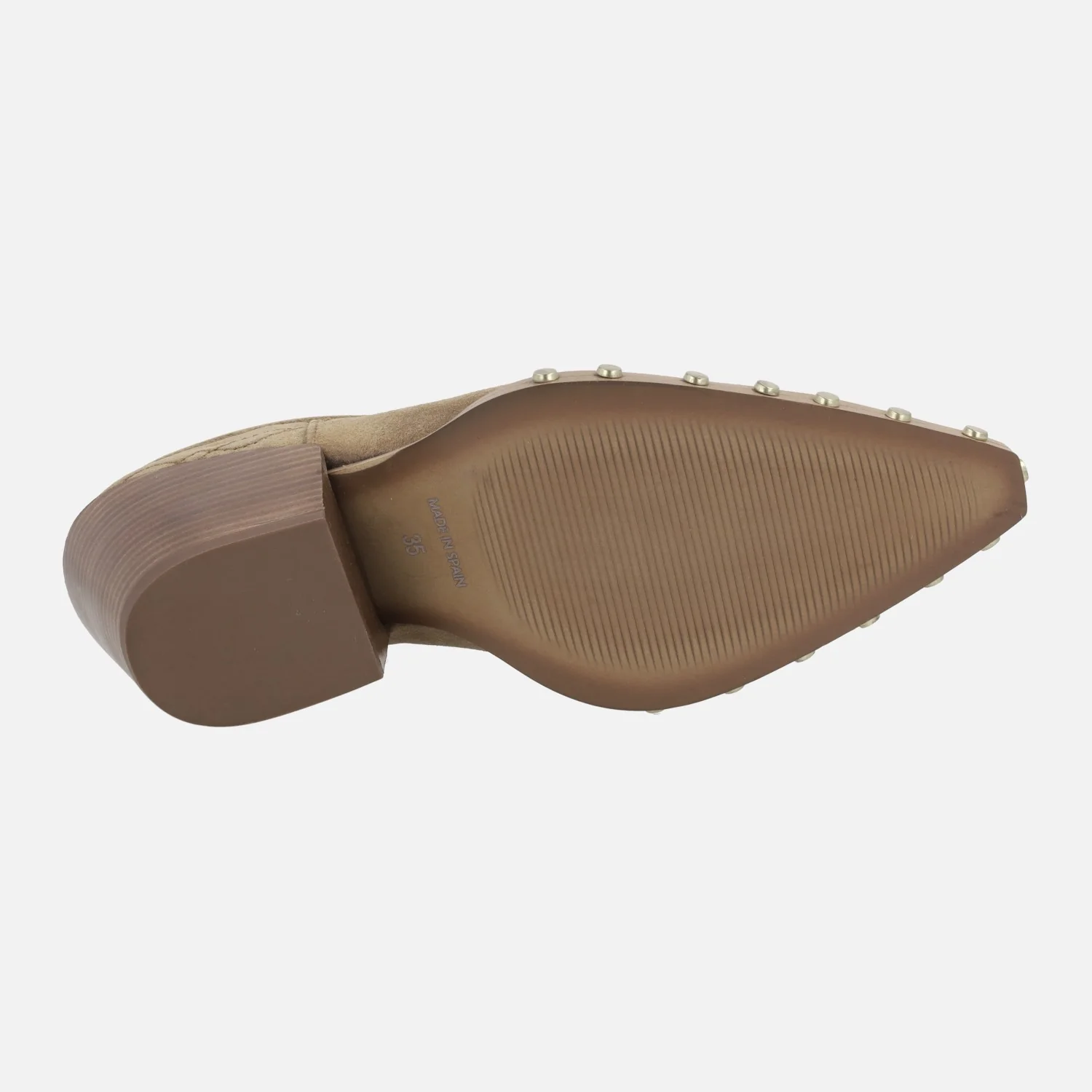 Zuecos para mujer estilo cowboy de la marca Alpe modelo Vermont 5023 cuero. Zuecos de serraje color cuero con bordados y tachas doradas. Interior mixto de piel y tejido. Tacones de 8 cms de altura. Made in Spain.