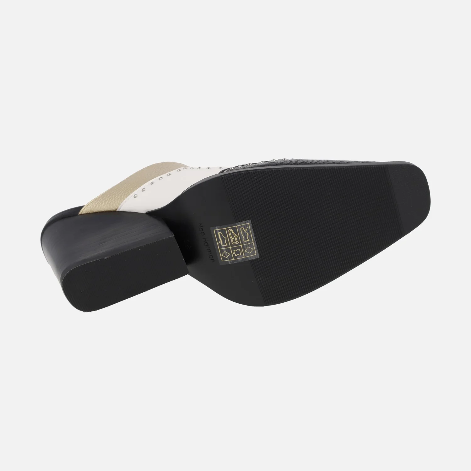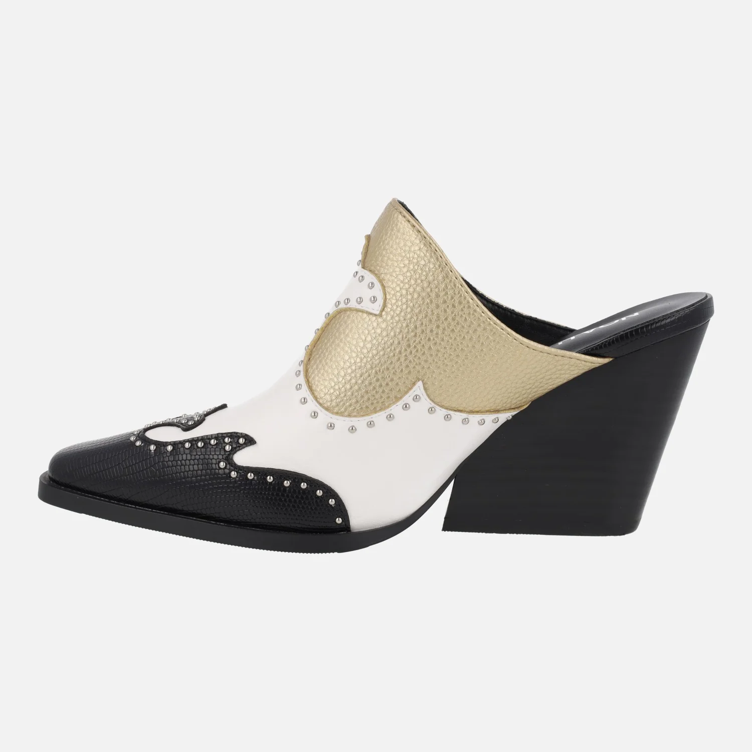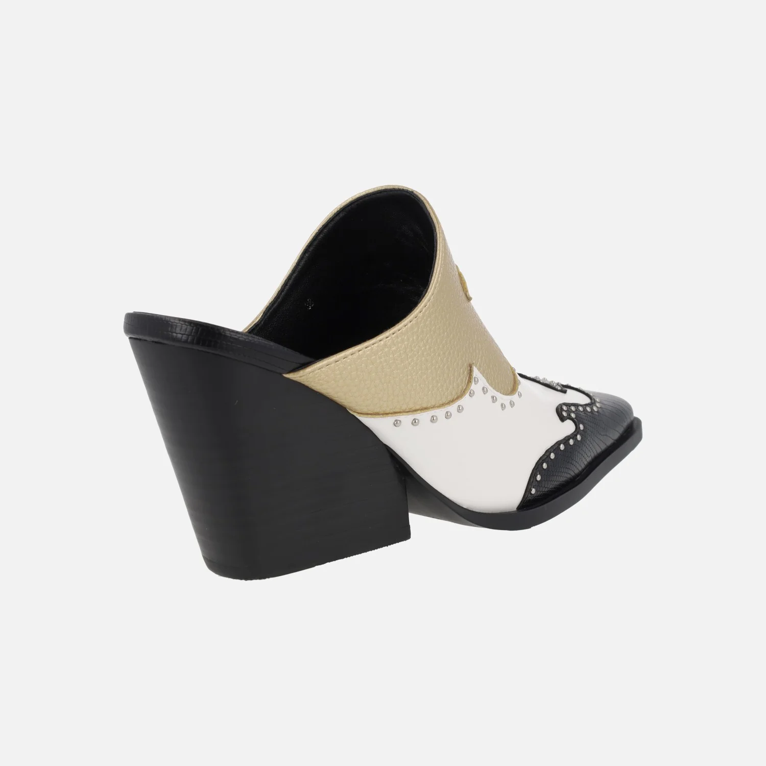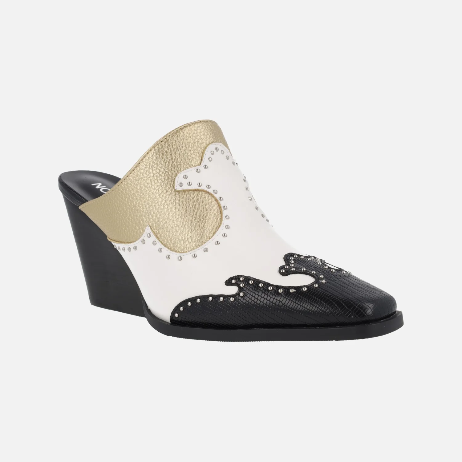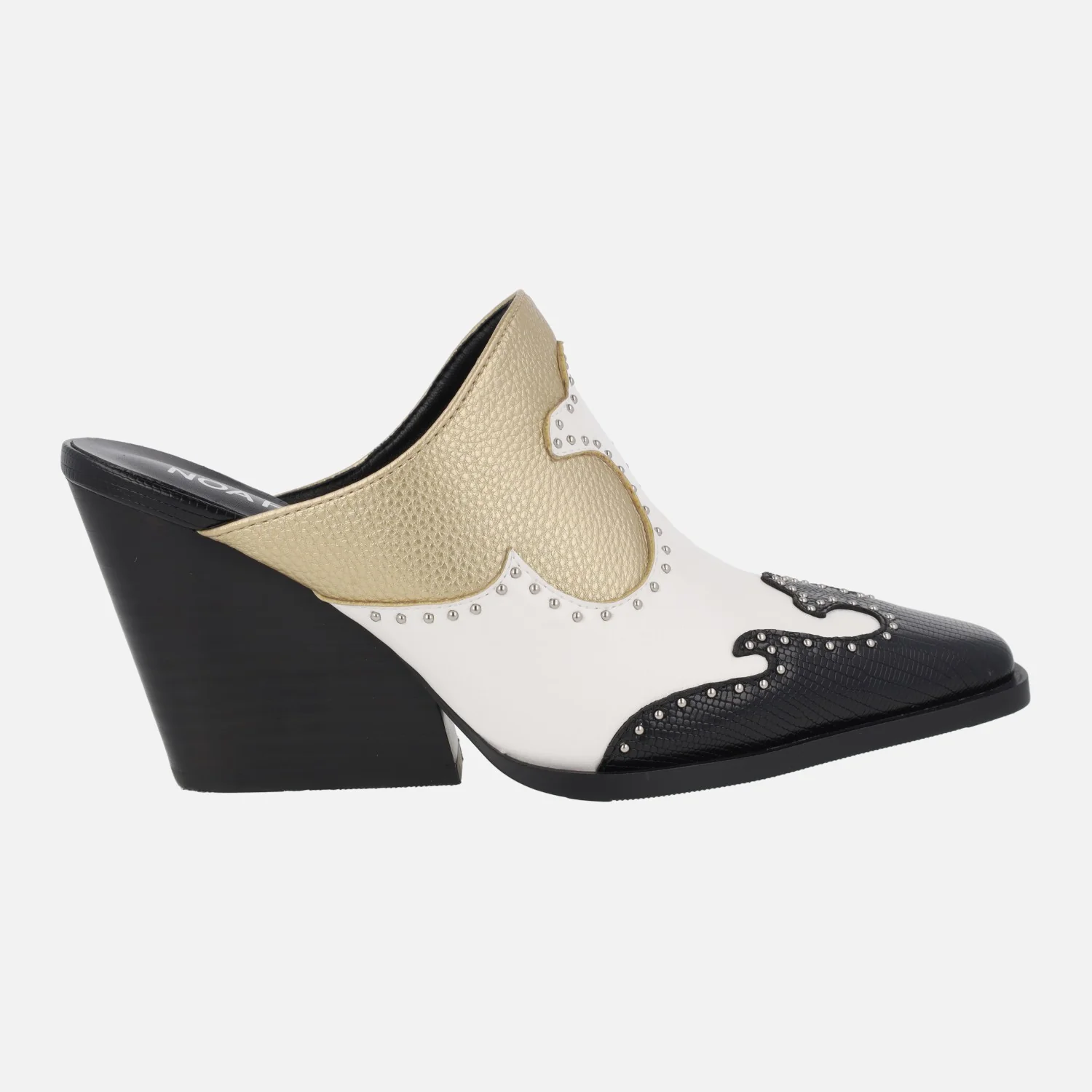 Zuecos para mujer estilo cowboy de la marca Noa Harmon, modelo André 9635 Negro/Blanco/Oro. Zuecos de puntera afilada, elaborados en piel vegana (sintéticos) en combinado tricolor y con pequeñas tachas metálicas. Interior de piel. Tacones anchos, de casi 9 cms de altura.