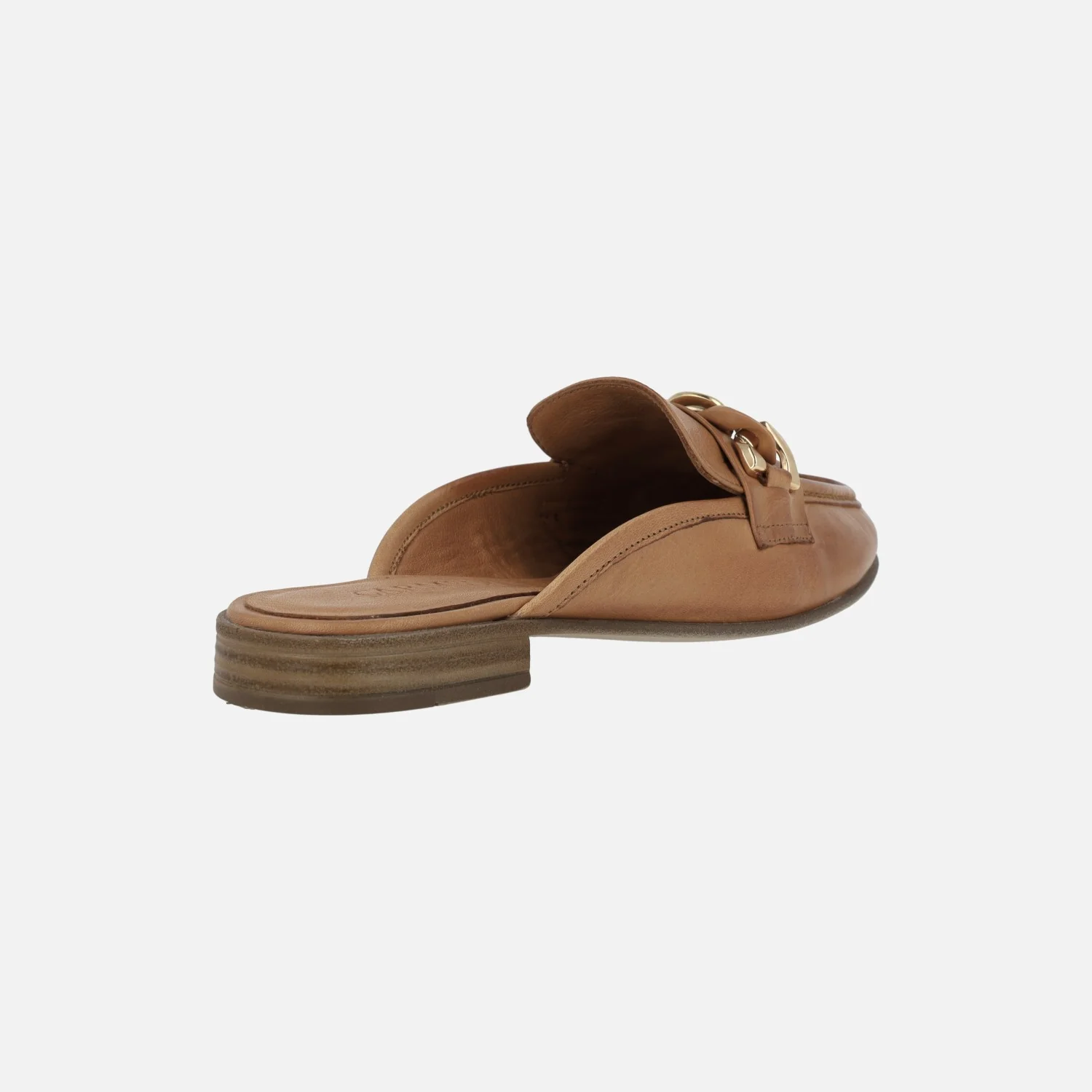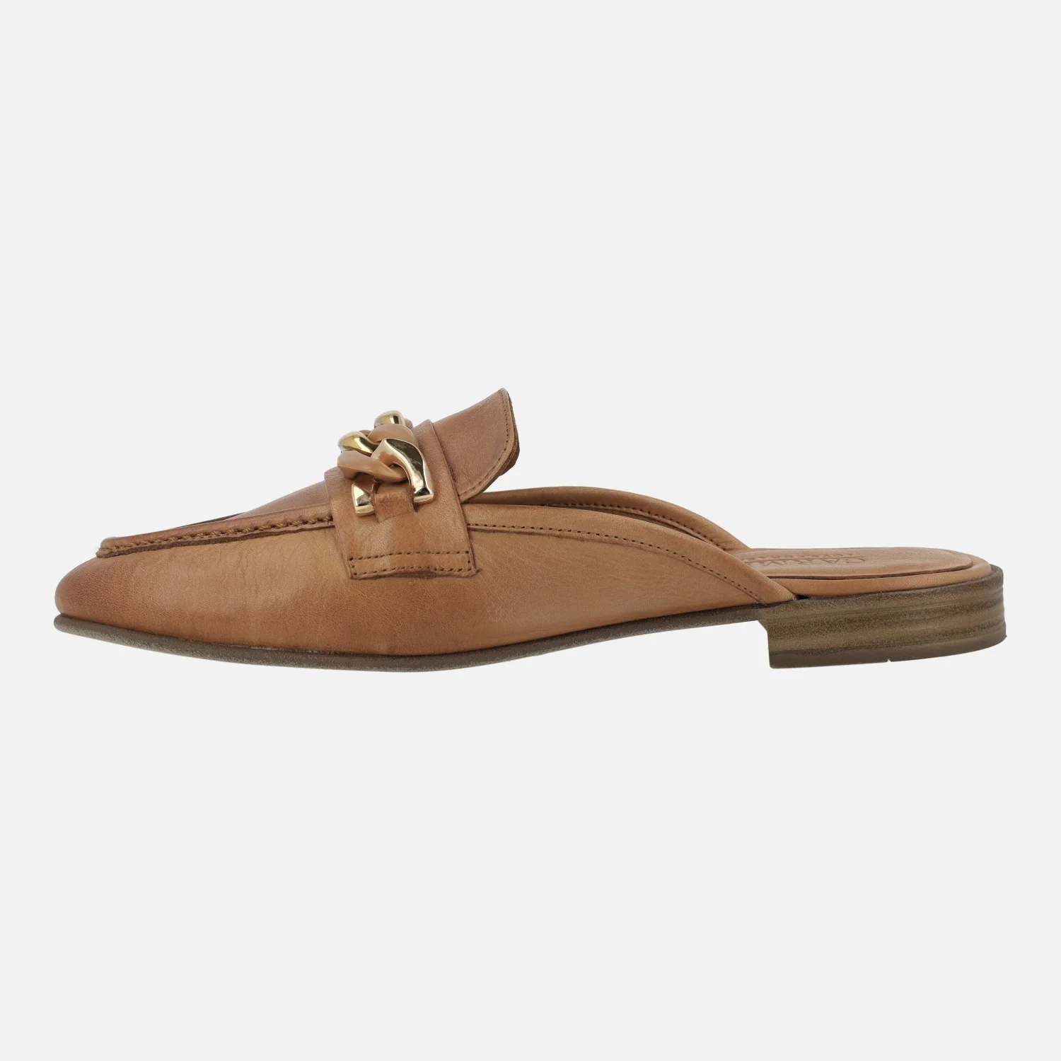 Zuecos para mujer estilo mocasines de la marca Carmela shoes modelo 161560 camel. Zuecos descalzos de talón, elaborados en piel camel, con adorno de cadena que combina metalizado oro y camel. Interiores de piel. Piso plano de goma fina, con apenas 1 cm de tacón.