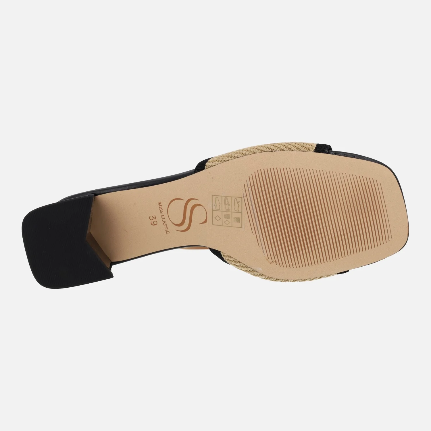 Zuecos mules para mujer de la marca Miss elastic modelo 073030-65 camel/negro. Sandalias formadas por una tira ancha delantera en combinado de tejido beige/camel con negro. Interiores en combinado textil y sintético. Tacones de 5,5 cm de altura.