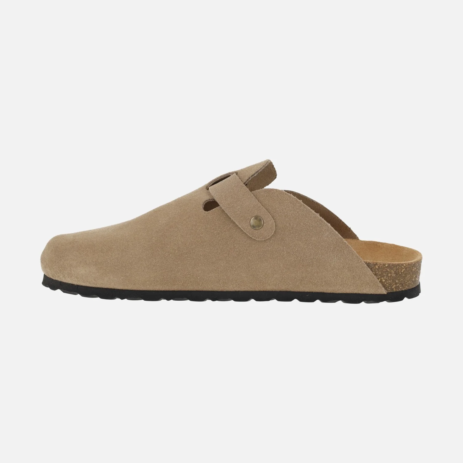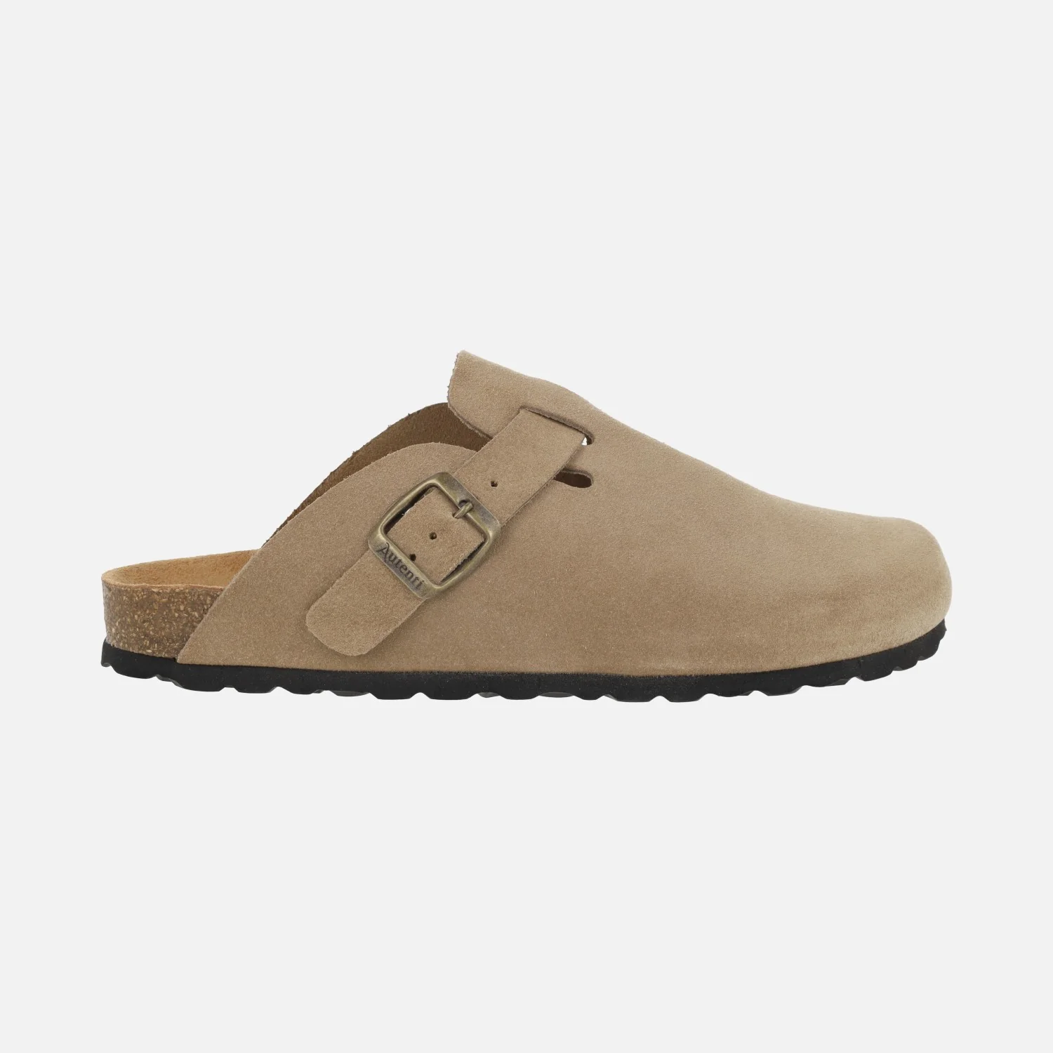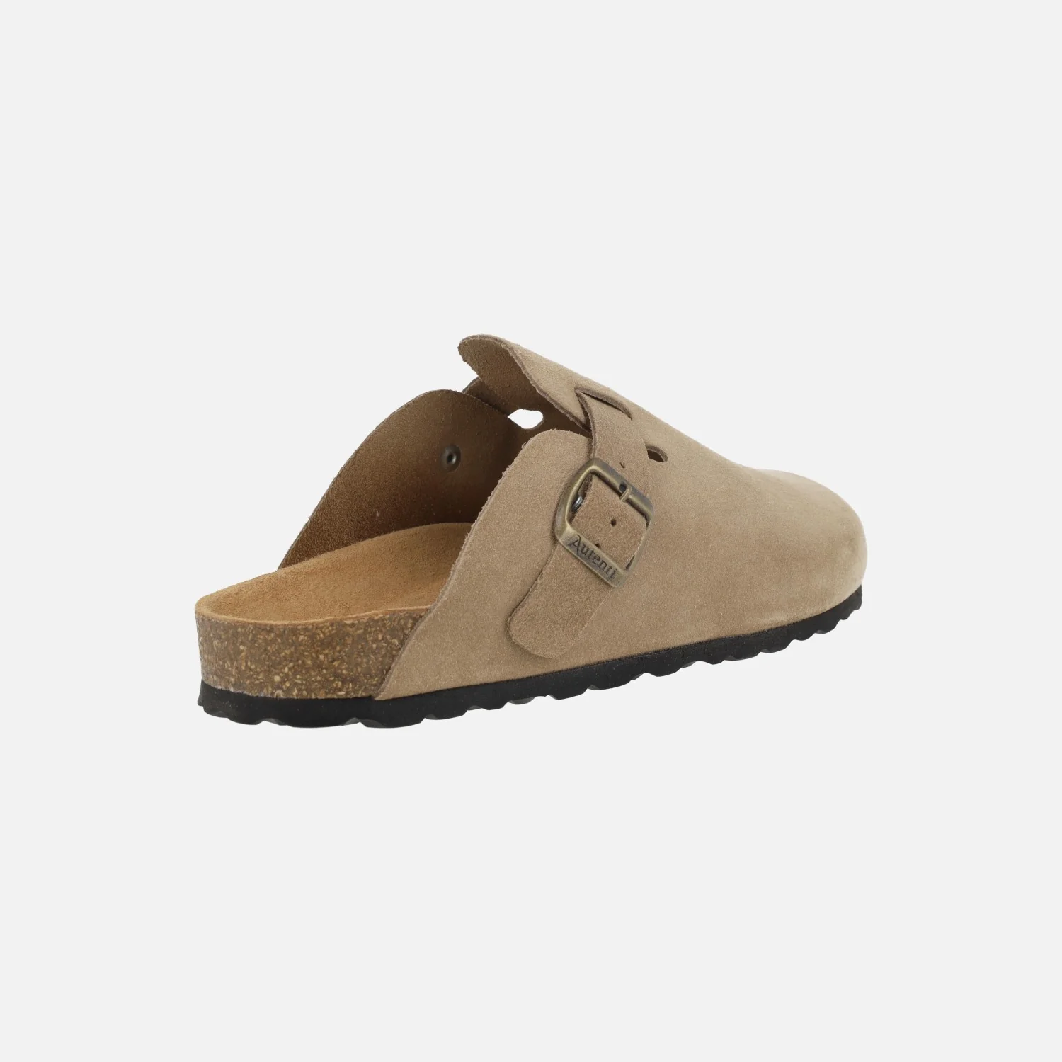 Zuecos confort estilo bio de la marca Autenti modelo 355 taupe (topo). Zuecos elaborados en piel serraje con tira ajustable con hebilla en color oro viejo. Interiores en piel. Suela sintética, entresuela de corcho. Altura trasera aproximadamente 2,5 cm.